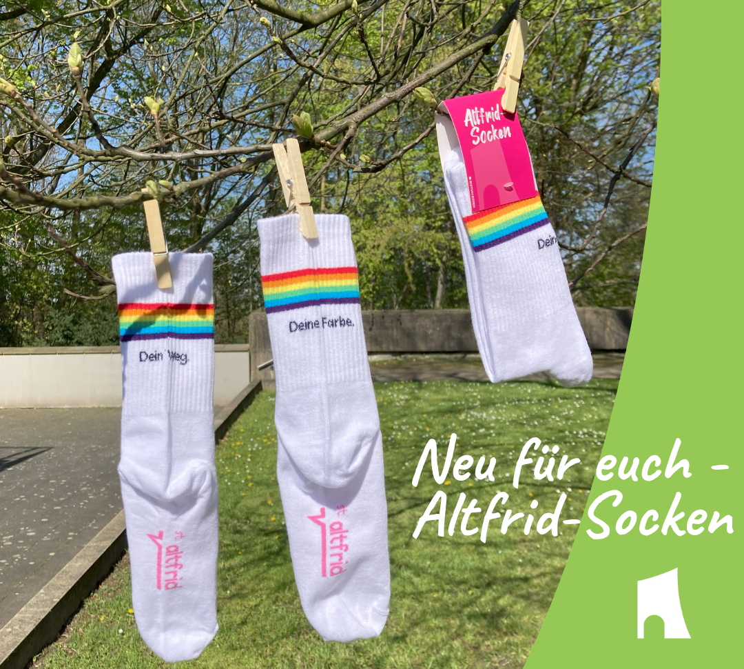 Die Altfrid-Socken sind ab sofort -während der jeweiligen Öffnungszeiten- für dich im Bistro und am Empfang des Jugendhauses erhältlich.